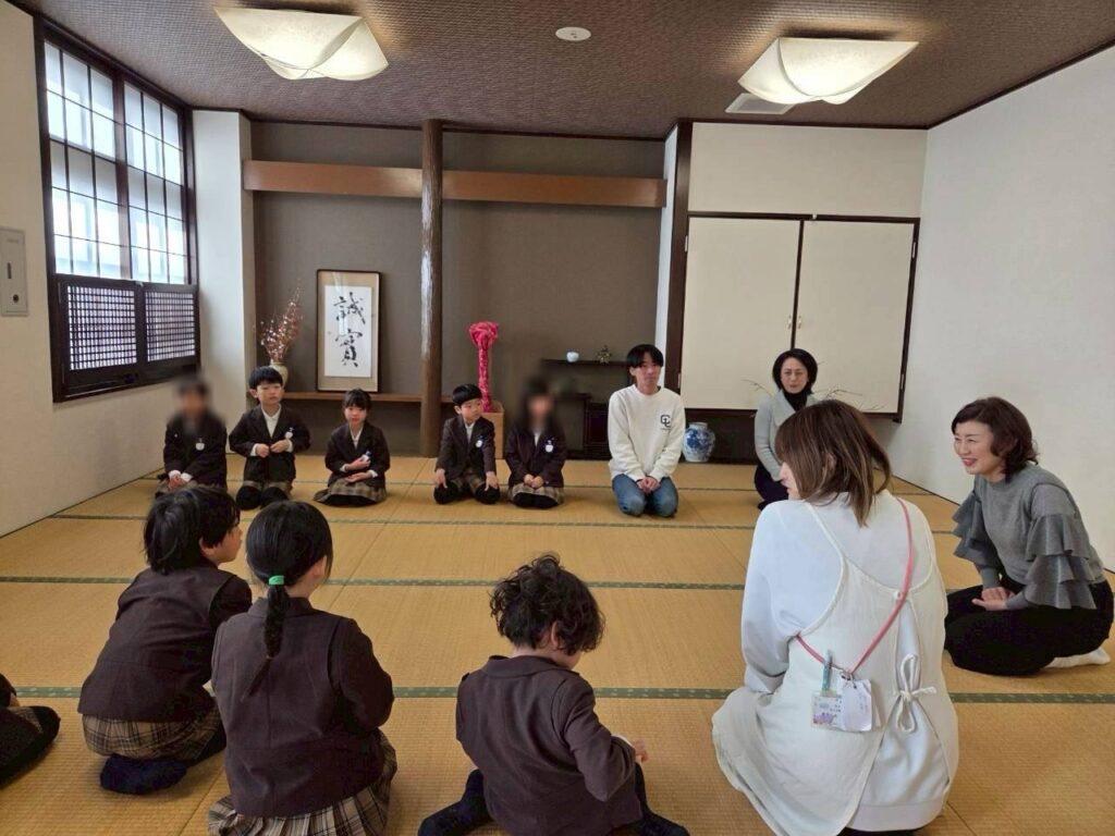 午後から、お茶の先生に来ていただき、年長さんは『おもてなしの会』で茶道体験🍵